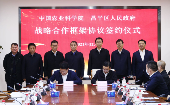12月1日,中國(guó)農(nóng)業(yè)科學(xué)院與北京市昌平區(qū)人民政府舉行共建國(guó)家未來(lái)農(nóng)業(yè)中心戰(zhàn)略合作框架協(xié)議簽約儀式。農(nóng)業(yè)農(nóng)村部黨組成員、中國(guó)農(nóng)科院院長(zhǎng)吳孔明,院黨組書(shū)記張合成,副院長(zhǎng)王漢中、劉現(xiàn)武,昌平區(qū)委書(shū)記甘靖中,區(qū)委副書(shū)記、代區(qū)長(zhǎng)支現(xiàn)偉,副區(qū)長(zhǎng)楊仁全、郭清堯參加活動(dòng)。劉現(xiàn)武和楊仁全代表雙方在協(xié)議上簽字。